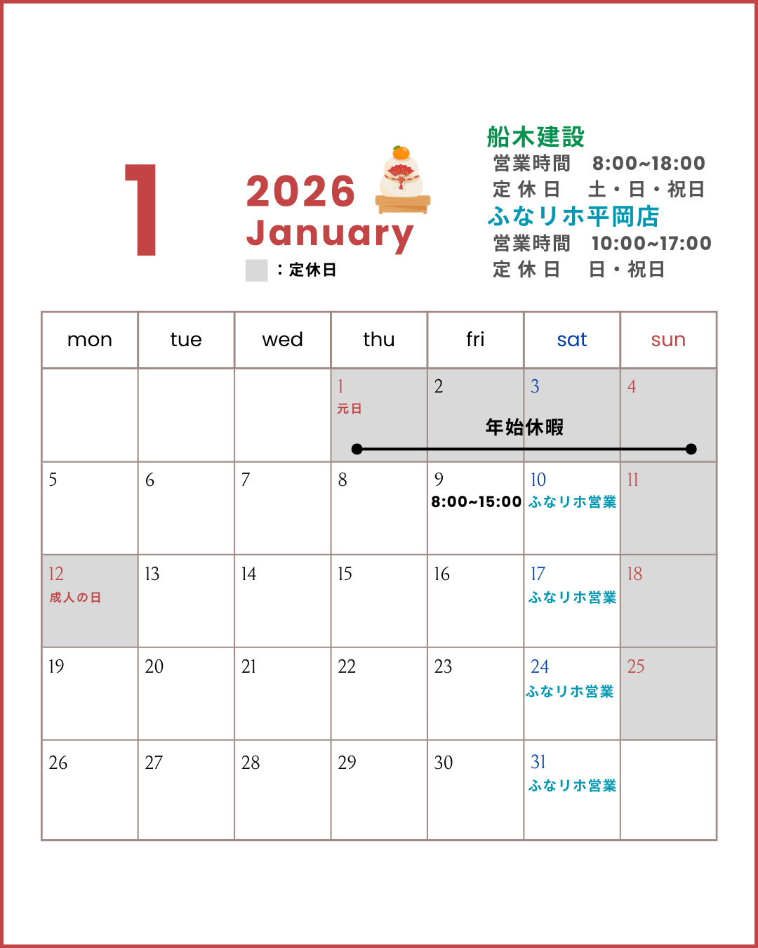 ※1月9日(金)は、15時から社内全体会議がある為、[船木建設]、[ふなリホ]共に営業時間が15時までとなります🙇♀️